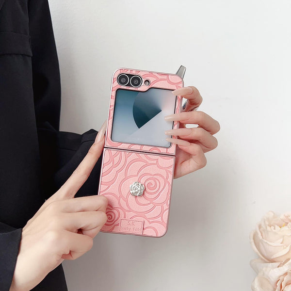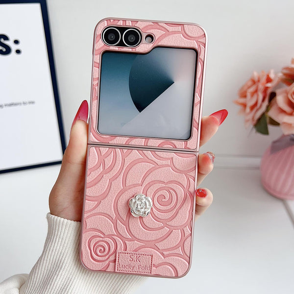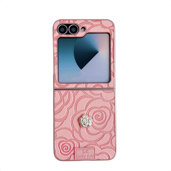 For Samsung Galaxy Z Flip5 5G 3D Camellia Plaid Fabric DIY PC Phone Case(Pink)