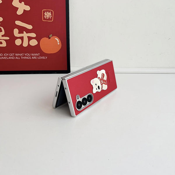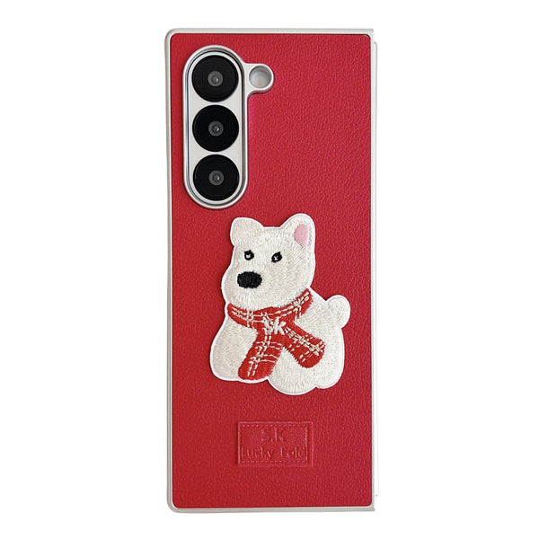 For Samsung Galaxy Z Fold5 5G Skin Fee Litchi Pattern Scarf Embroidered Dog Phone Case(Red)