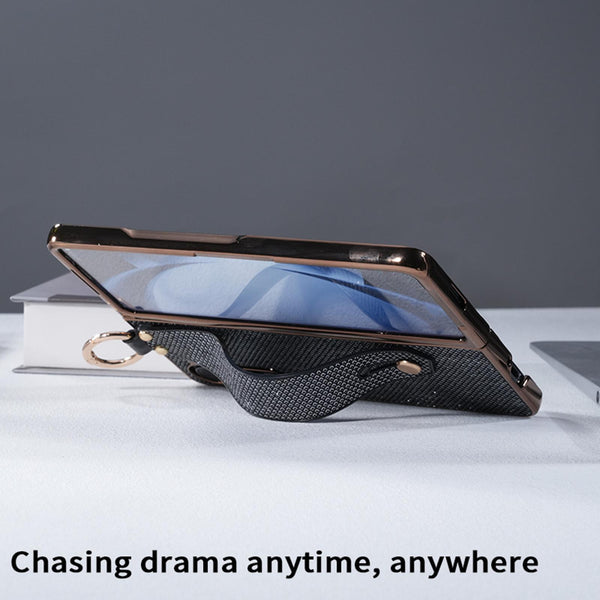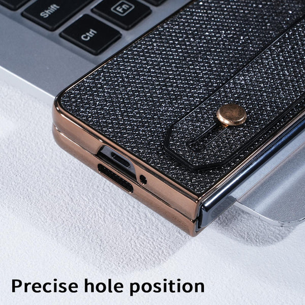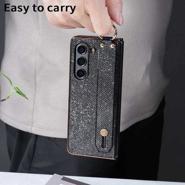 For Samsung Galaxy Z Fold6 5G Integrated Electroplated PC Glitter Texture Shockproof Phone Case with Wrist Strap / Ring(Gold)