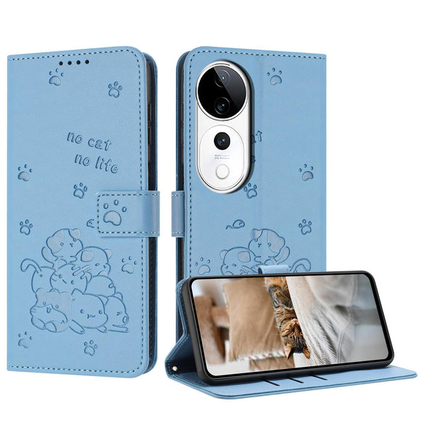 For vivo V40 / V40 Pro / T3 Ultra Embossed Kitten Phone Leather Case with Lanyard(Blue)