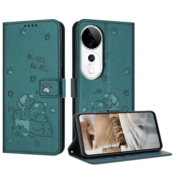For vivo V40 / V40 Pro / T3 Ultra Embossed Kitten Phone Leather Case with Lanyard(Dark Green)