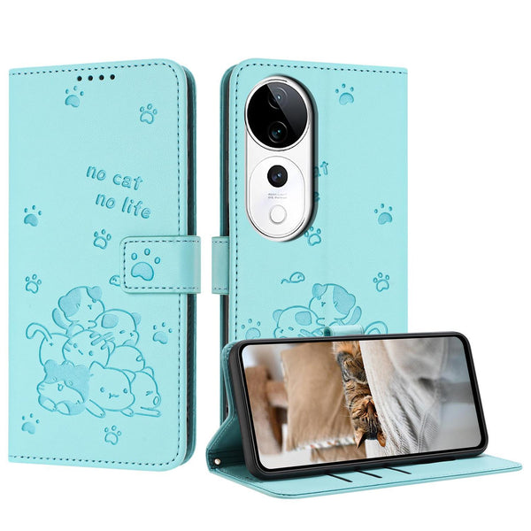 For vivo V40 / V40 Pro / T3 Ultra Embossed Kitten Phone Leather Case with Lanyard(Mint Green)