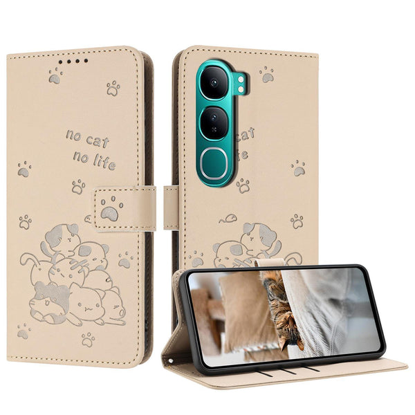 For vivo Y300 Global / V40 Lite IDN Embossed Kitten Phone Leather Case with Lanyard(Beige)
