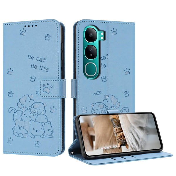 For vivo Y300 Global / V40 Lite IDN Embossed Kitten Phone Leather Case with Lanyard(Blue)