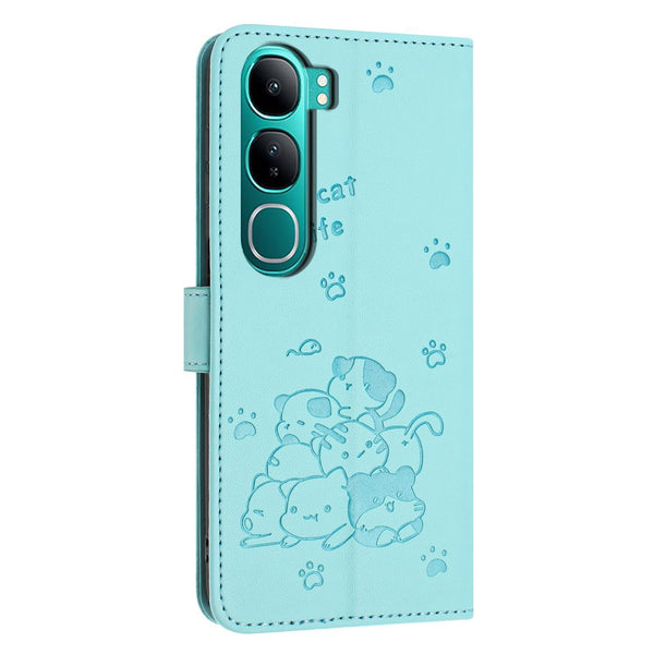 For vivo Y300 Global / V40 Lite IDN Embossed Kitten Phone Leather Case with Lanyard(Mint Green)