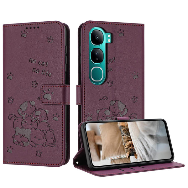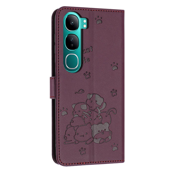 For vivo Y300 Global / V40 Lite IDN Embossed Kitten Phone Leather Case with Lanyard(Wine Red)
