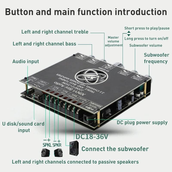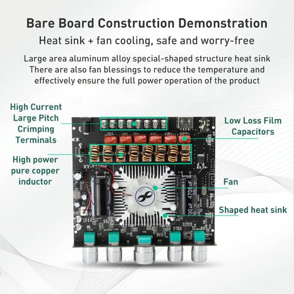 2. Bluetooth-compatible 5.1 audio power amplifier module: 2.1 dual channel stereo output, output power 220W * 2 (left and right channels) + 350W (subwoofer), pure HiFi sound quality. The treble is pure and transparent, the midrange is gentle and delicate, and the bass is surging and shocking.