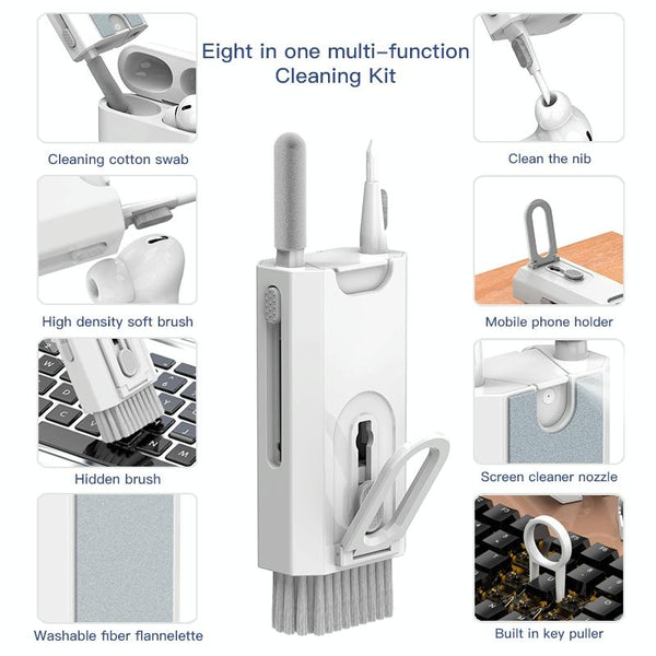 1. Multi-functional design: can clean headphones, can be used as a cell phone stand, can clean the keyboard, with screen cleaning liquid nozzle can clean the screen, washable fiber lint wipe the screen, key puller