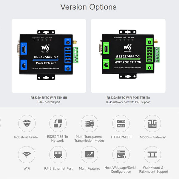 Waveshare Industrial Grade Serial Server RS232/485 to WiFi / Ethernet RJ45 Network Port