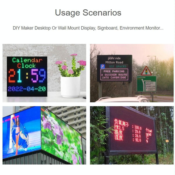 2. 64 x 64 pixels, 3mm pitch, allows displaying text, colorful image, or animation
