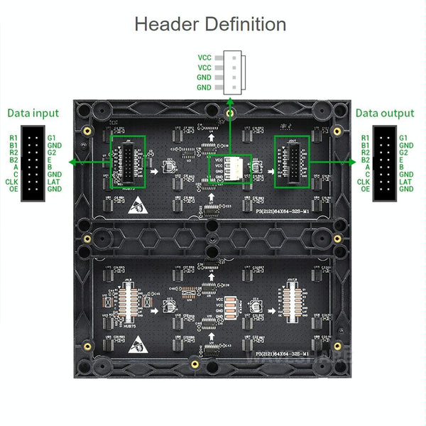 4. Onboard two HUB75 header, one for controller data input, one for output, chain support