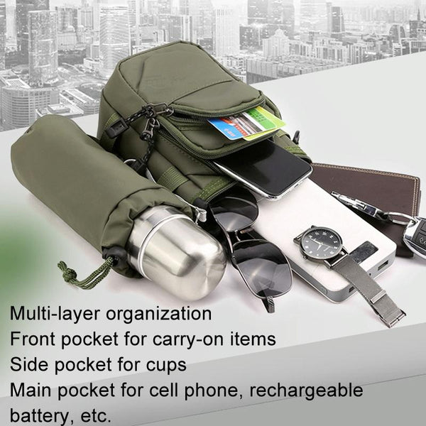 4. Multi-layer storage, the front pocket can be used to put your belongings, the side pocket can be used to put a cup of water, and the main pocket can be used to put a cell phone, rechargeable treasure and so on