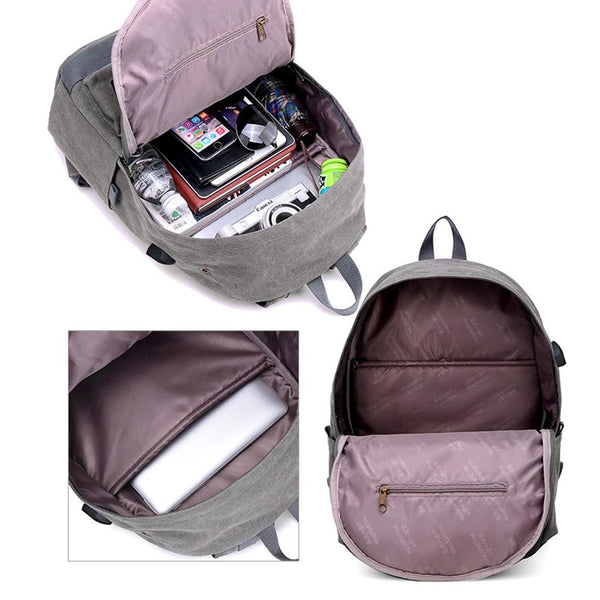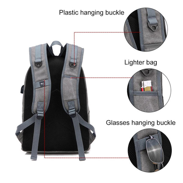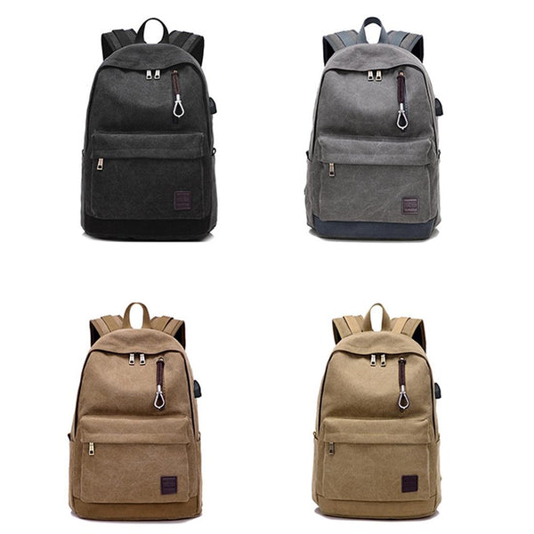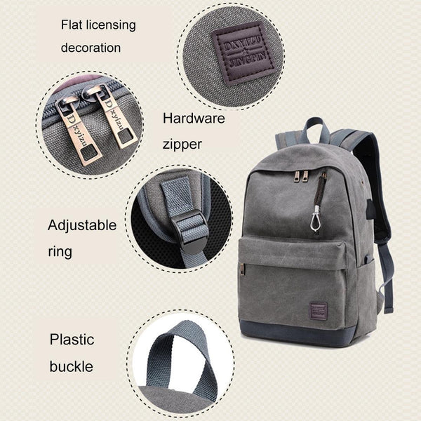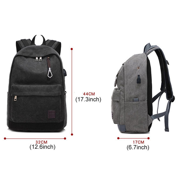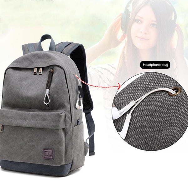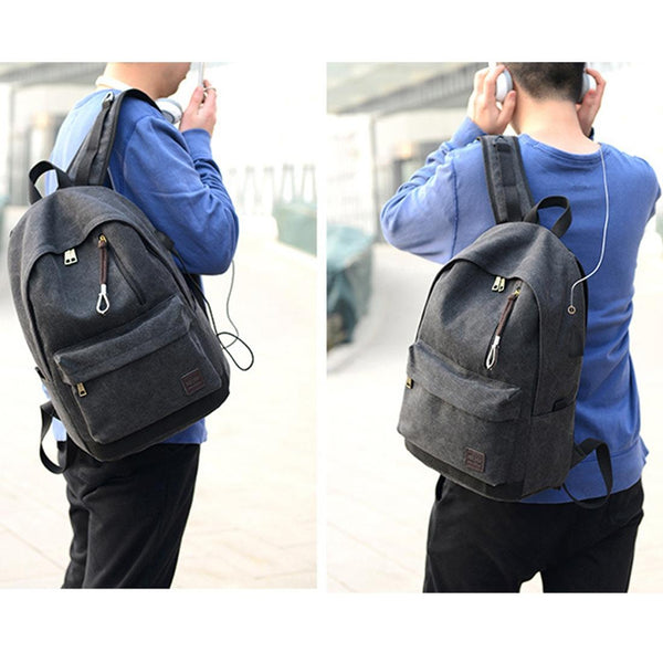 Multi-Function Travel Casual Canvas Backpack Students Bag with External USB Charging Interface & Headphone Jack (Black)