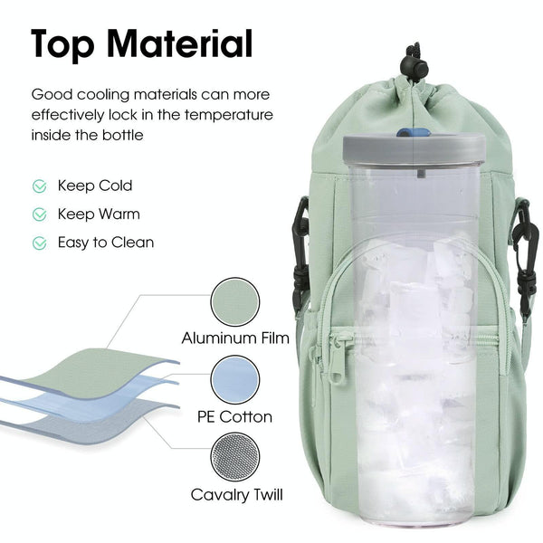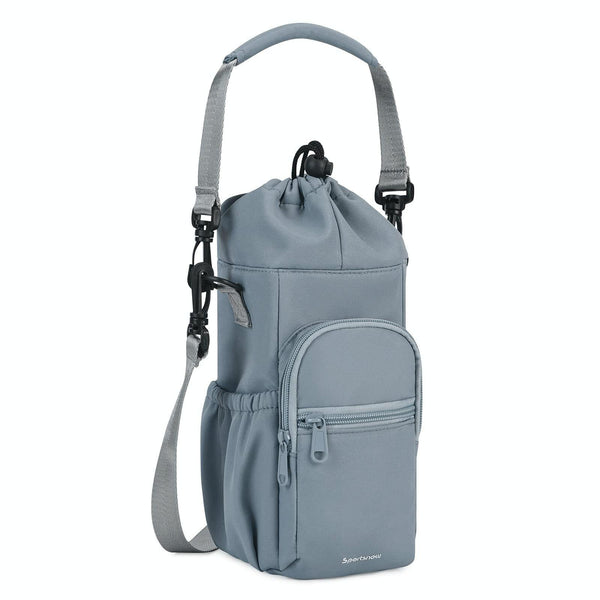 1. Outdoor Water Bottle Carrying Bag, which features a drawstring closure water bottle pocket that can hold water bottles up to 40 ounces. In addition, it has 2 small zipper pockets and 2 side pockets, providing ample space to store small daily essentials such as mobile phones, keys, and wallets.