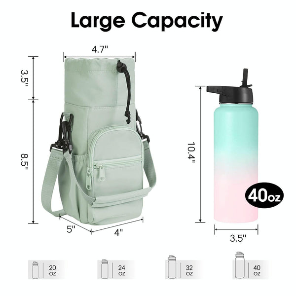 1. Outdoor Water Bottle Carrying Bag, which features a drawstring closure water bottle pocket that can hold water bottles up to 40 ounces. In addition, it has 2 small zipper pockets and 2 side pockets, providing ample space to store small daily essentials such as mobile phones, keys, and wallets.