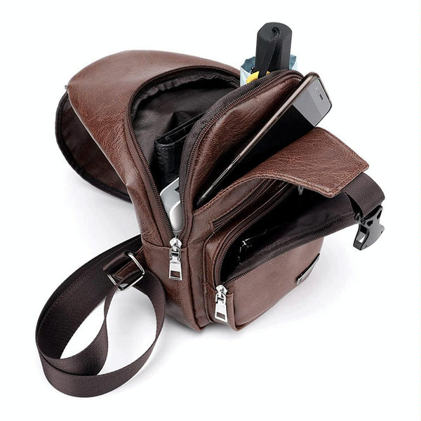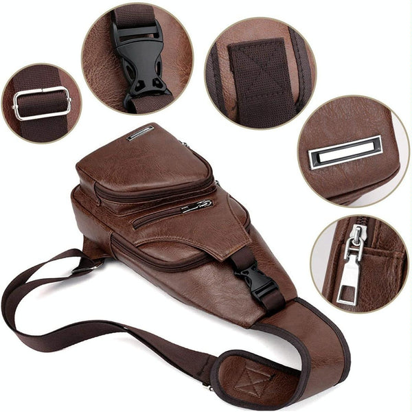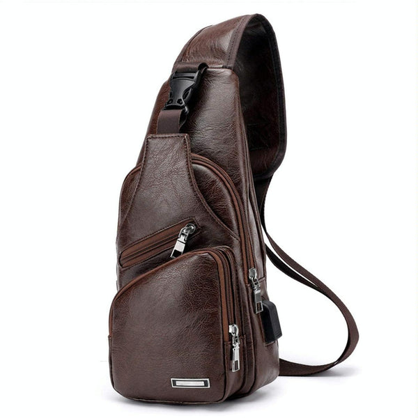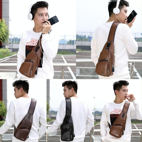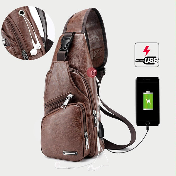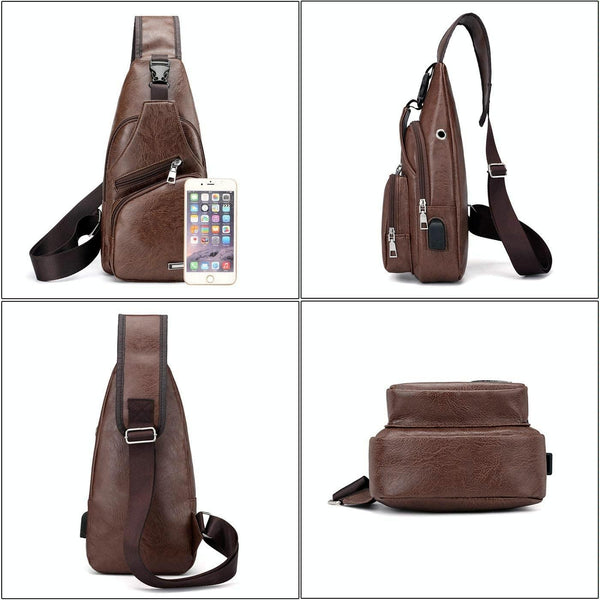 Waterproof Leisure PU Leather Single Shoulder Bag Men Chest Bag with USB Charging Port and Headphone Hole(Dark Brown)