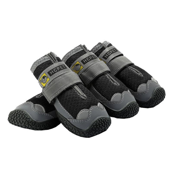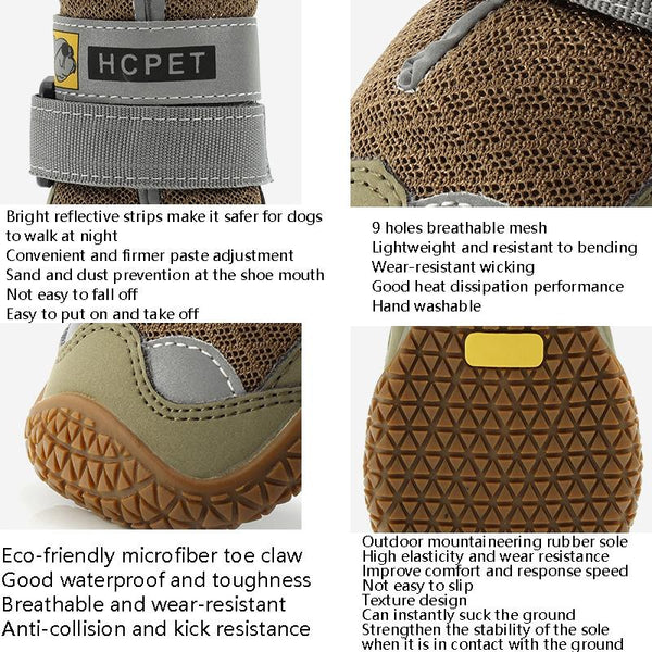 Protect your dog's paws in all seasons with these breathable mesh dog shoes. This set of four grey HCPET dog shoes, size No.1 (4cm), features a 9-hole mesh upper for ventilation and comfort, keeping paws cool and dry. Durable microfiber toe caps provide waterproof protection and added toughness against rough terrain. Enhanced visibility is ensured with bright reflective strips for safe nighttime walks. The secure hook-and-loop closure makes them easy to put on and take off, while also preventing sand and dust from entering. Non-slip rubber outsoles offer excellent traction and stability on various surfaces, perfect for everyday walks and outdoor adventures. Approximate weight per set is 108g. Available in sizes 1-8.