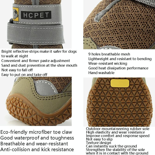 Protect your dog's paws with these breathable, durable dog shoes. This set of 4 red HCPET dog shoes in size 2 (4.5cm) are perfect for all seasons. Crafted with a 9-hole breathable mesh upper, these shoes keep paws cool and comfortable while offering excellent protection. The eco-friendly microfibre toe cap adds durability and water resistance, guarding against bumps and scrapes. Enhanced visibility is ensured with bright reflective strips, making nighttime walks safer. The secure hook-and-loop closure system makes them easy to put on and take off, while also keeping out dirt and debris. The high-grip rubber soles provide excellent traction and stability on various terrains. Weighing approximately 116g per set, these size 2 dog shoes offer the perfect balance of comfort and protection for your canine companion. Search terms: dog shoes, dog boots, paw protection, breathable dog shoes, reflective dog shoes, size 2 dog shoes, 4.5cm dog shoes, red dog shoes, all-season dog shoes, durable dog shoes, HCPET dog shoes, pet supplies, dog accessories.