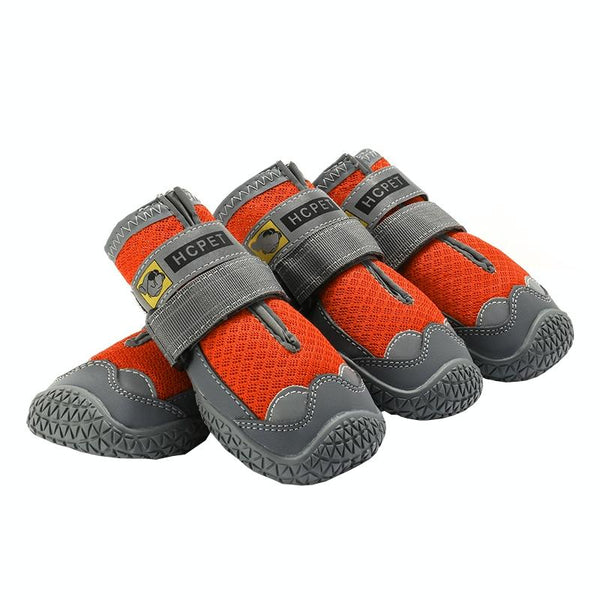 Protect your dog's paws with these breathable, durable dog shoes. This set of 4 orange HCPET dog shoes, size 8 (7.5cm), are perfect for all seasons. Featuring a 9-hole mesh upper for ventilation, reflective strips for night-time visibility, and a tough rubber sole for grip and protection on any terrain.