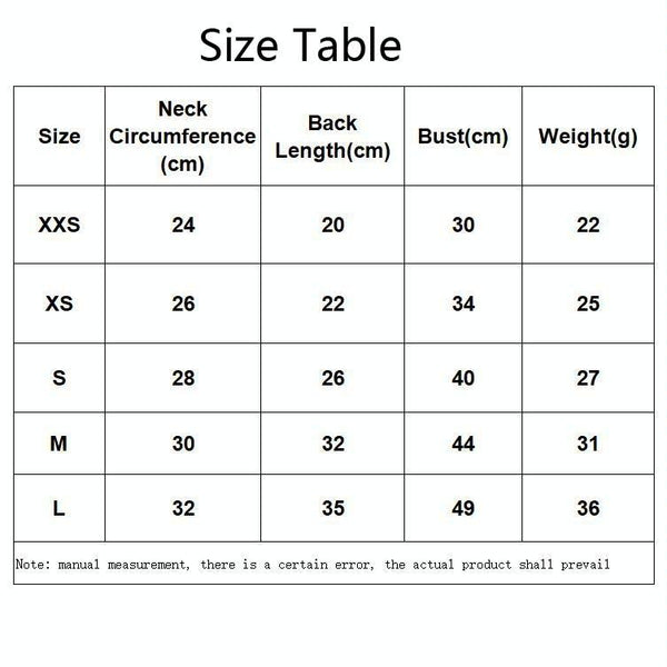 Size | Weight (grams) | Neck Circumference (cm) | Back Length (cm) | Bust (cm) |