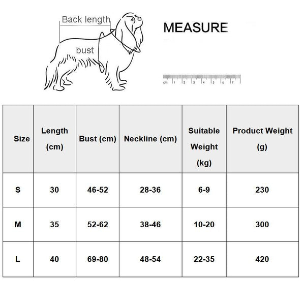 Small (S): Length 30cm, Bust 46-52cm, Neck 28-36cm, Weight 6-9kg (Life Jacket Weight: 230g)