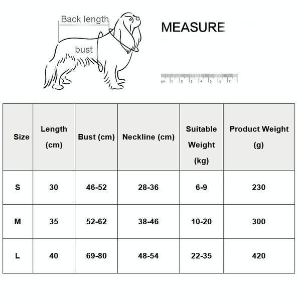 Size Length (cm) Bust/Chest (cm) Neck Circumference (cm) Weight (kg) Product Weight (g)