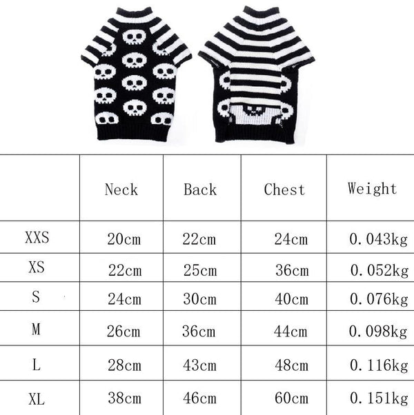 Keywords: Halloween pet costume, dog sweater, cat sweater, skull sweater, pet clothes, spooky pet costume, Halloween pet apparel, dog Halloween costume, cat Halloween costume.