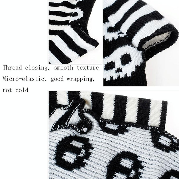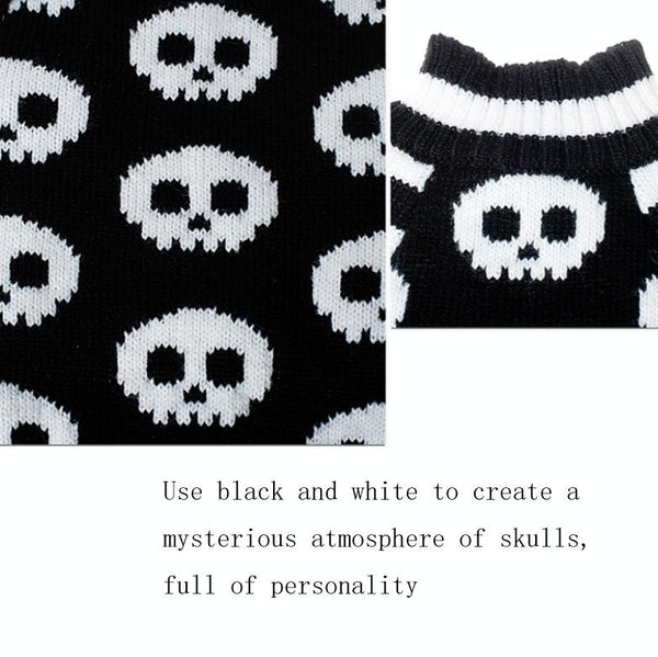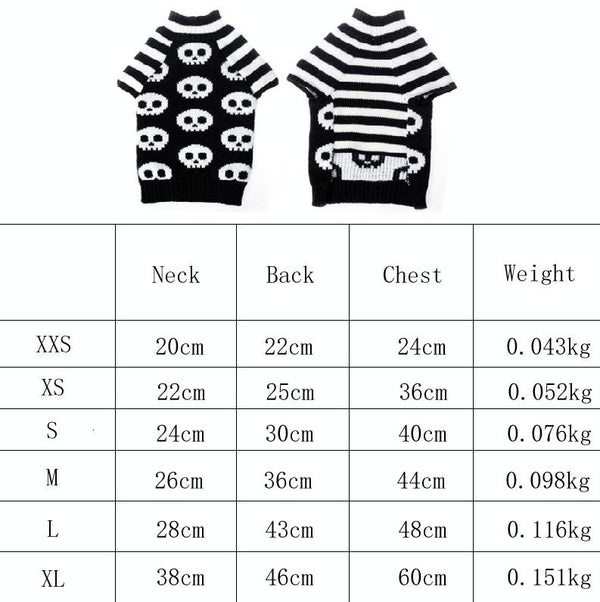 Dress your furry friend in this spooky-cute Halloween Skull Pet Sweater. This black and white skull design adds a touch of mysterious charm to your cat or dog's Halloween costume. Crafted from soft, smooth acrylic with a touch of stretch, this comfortable sweater ensures your pet stays warm and cosy during the spooky season. Available in sizes XXS to XL. Please consult our size chart below to ensure the perfect fit for your pet.