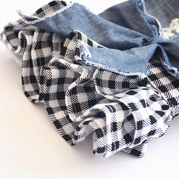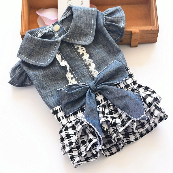 Dress your pampered pooch in this adorable autumn and winter denim skirt. Crafted from soft, breathable cotton denim and featuring a playful knitted hem, this stylish skirt is perfect for small dogs. The charming bow detail and multi-layered pleated plaid design add a touch of princess-like elegance. This comfortable and chic skirt is ideal for keeping your furry friend warm and fashionable during the colder months. Available in size L.