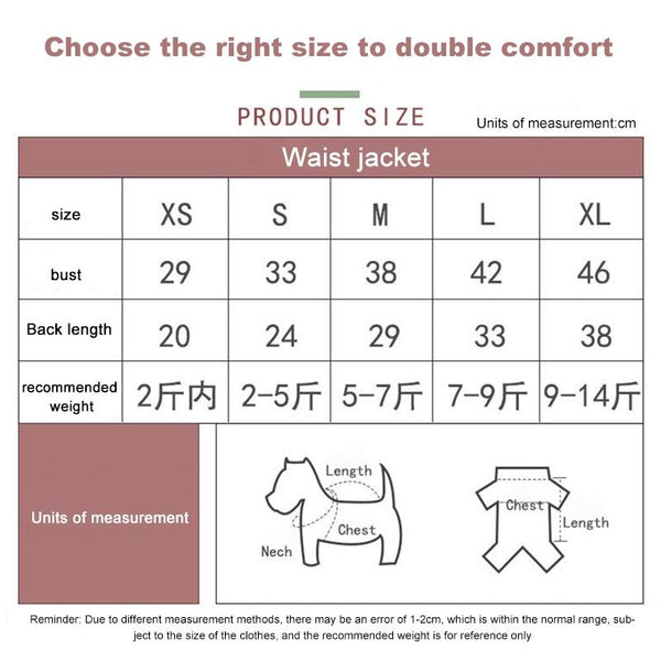 Keep your small dog cosy and warm this winter with this stylish and practical dog coat. Made with soft, warm fleece and lined with sponge velvet, this jacket offers superior comfort and insulation against the cold. The attached fur-trimmed hood provides extra protection from the elements, keeping your furry friend's head warm and dry. Available in a range of colours, including this vibrant green, this coat is perfect for Chihuahuas, Yorkshire Terriers, and other small breeds. The elasticated design ensures a snug fit and allows for easy on/off. Choose from sizes XS to XL to find the perfect fit for your canine companion. See our size chart below for detailed measurements (back length, chest girth, and weight recommendations):