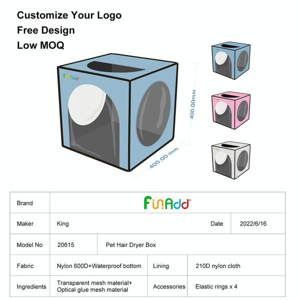 Dry your pet quickly and comfortably with the FUNADD Pet Bath Drying Box. Suitable for small dogs and cats up to 5kg, this portable and foldable dryer cage makes bath time a breeze. Crafted from durable, non-toxic oxford cloth and nylon mesh, it's designed with your pet's safety and comfort in mind.