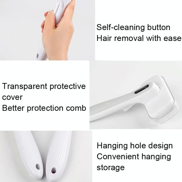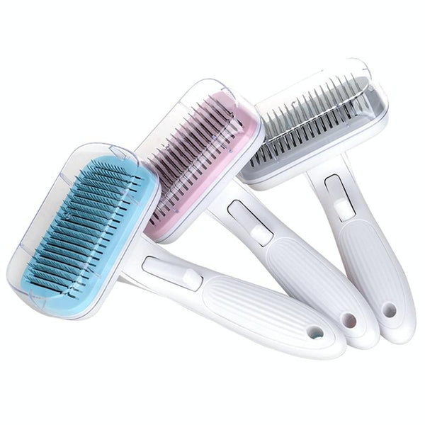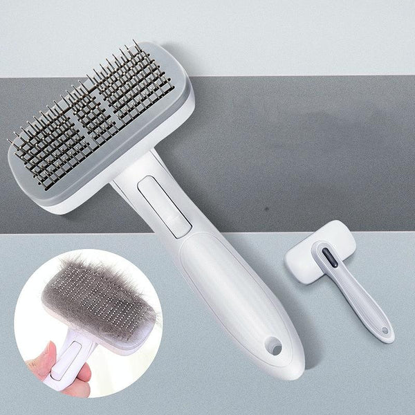 Effortlessly groom your furry friend with this self-cleaning pet comb, designed for both cats and dogs. Featuring bendable, anti-static steel needles, this brush gently removes loose hair while protecting your pet's skin. The innovative self-cleaning button makes hair removal quick and easy, while the transparent protective cover keeps the comb clean and hygienic. Crafted from durable ABS and TPR materials, this comb is built to last. The ergonomic design and non-slip grip ensure comfortable use, and the integrated hanging hole allows for convenient storage. Approximate size: 19.5 x 10.7 x 5.8cm. Weight: approximately 220g.