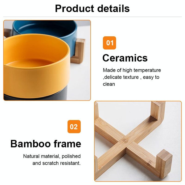 This stylish 15.5cm ceramic pet bowl with a yellow wooden stand is purrfect for cats and small dogs. Holding a generous 850ml, it's ideal for dry kibble, wet food, or water. The raised stand promotes comfortable dining, helping to protect your pet's neck and digestion. Crafted from smooth, easy-to-clean ceramic and durable bamboo, this elevated pet bowl is both practical and attractive. The non-slip wooden stand adds stability, preventing spills and messy mealtimes.