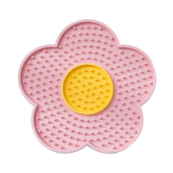 Soothe your pet and slow down mealtimes with this 15cm Sunflower Silicone Pet Licking Tray in pink. Made from food-grade silicone with no fluorescent agents, this lick mat is safe for cats and dogs. Its textured surface promotes slower eating, reducing choking risks and improving digestion. Thirty-one suction cups secure the mat to tiles or other smooth surfaces, encouraging a healthier eating posture and reducing strain on your pet's spine. Durable and easy to clean, this lick mat is microwave and freezer safe. Approximate size: 15 x 15 x 1.5cm.
