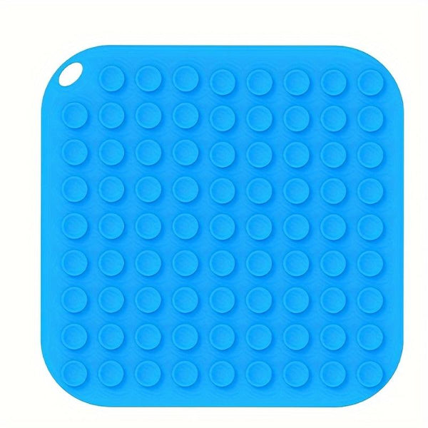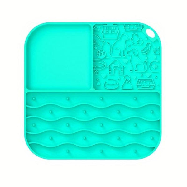 Soothe and entertain your dog with this mint-coloured 3-grid pet licking mat. Spread peanut butter, yoghurt, or your dog's favourite soft treat across the textured surface to encourage slower eating and release calming endorphins. Made from food-grade silicone, this lick mat is safe, durable, and resistant to chewing. The strong suction cups secure the mat to any smooth surface, like your bath or shower wall, keeping it in place and preventing spills. This slow feeder is perfect for distracting anxious dogs during bath time, grooming, or vet visits. It also promotes healthy digestion by slowing down mealtimes. Approximate size: 200 x 200 x 24.5mm, weight: 229g.