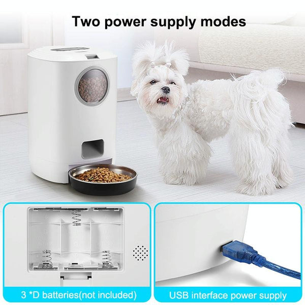 Keep your cat or dog fed and happy with this 4.5L Smart Automatic Pet Feeder. This electronic feeder dispenses up to 4 meals a day, with a maximum of 20 servings (approximately 10g each) per meal, perfect for managing portion control and ensuring your pet's dietary needs are met. Suitable for dry food between 5mm-15mm, this feeder features a convenient 10-second voice recorder, allowing you to call your pet for mealtimes. A removable metal food tray makes cleaning a breeze, while the dual power supply (DC5V/1A adapter or 3 x AA batteries - not included) ensures uninterrupted feeding, even during power outages. The built-in memory function saves your feeding schedule, and a smart chip protects the motor from blockages. Dimensions (with tray): 30cm x 19.8cm x 32.8cm. Dimensions (without tray): 19.8cm x 19.8cm x 30cm.