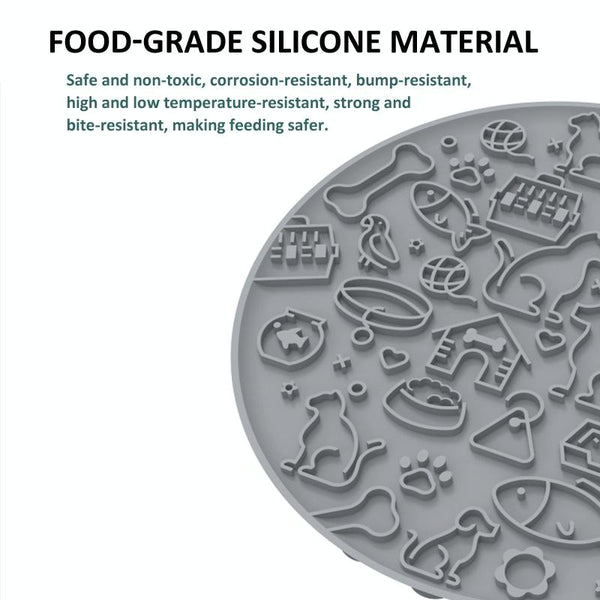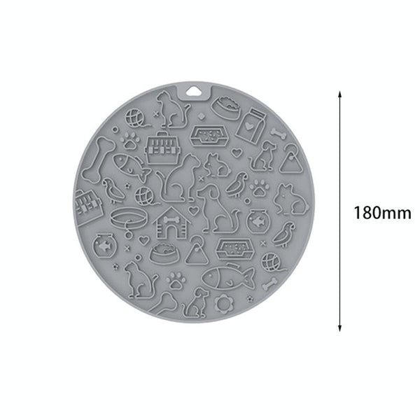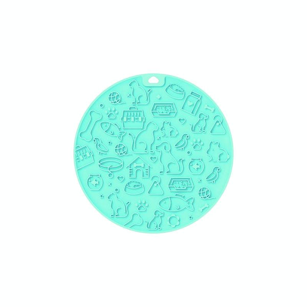 Soothe and entertain your dog or cat with this 7-inch mint-coloured pet licking mat. Spread peanut butter, yoghurt, or your pet's favourite soft treat across the textured surface. The raised, cartoon design slows down feeding, promoting healthier digestion and releasing endorphins for a calming effect. Made from food-grade silicone, this non-slip mat features strong suction cups to securely attach to any smooth surface, like your bath or shower wall, keeping your pet entertained during grooming. This lick mat is also ideal for reducing anxiety during stressful situations. Durable, bite-resistant, and easy to clean, this lick mat is a perfect gift for anxious or easily distracted pets. Dimensions: 180 x 180 x 8mm, Weight: Approx. 70g.