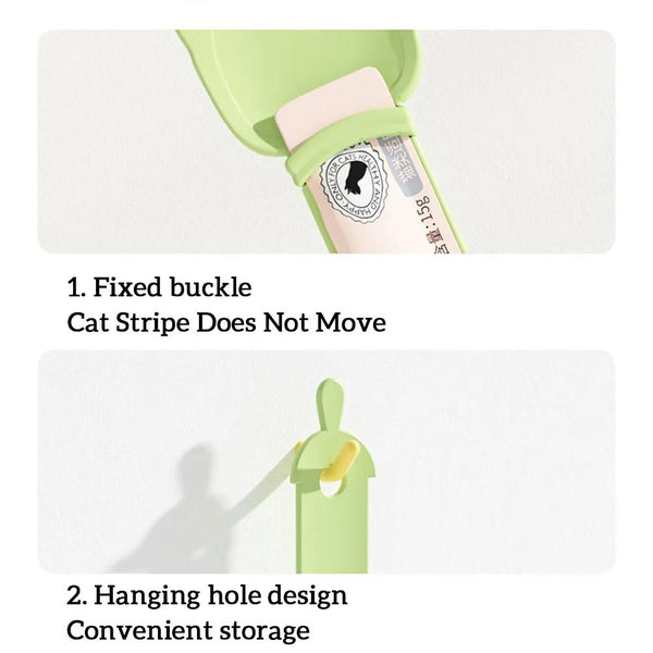 Effortlessly feed your feline friend their favourite treats with this Cat Strip Squeezer. Made from food-grade HIPS, this handy feeding spoon is safe for your cat and built to last. The extended handle and 6.5cm wide spoon mouth make feeding a breeze, preventing spills and mess. The clever fixed ring buckle secures the cat strip, while the sliding action allows for smooth and controlled dispensing. Easy to clean and store with its convenient hanging hole, this orange Cat Strip Squeezer is a must-have for every cat owner. Measures 27 x 6.5 cm and weighs just 40g.