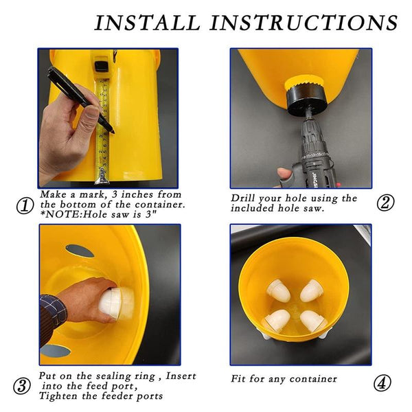 Automate your chicken feeding with this set of six DIY Automatic Poultry Feeders. Designed to minimise waste and keep feed dry, these feeders are perfect for buckets, barrels, troughs, or bins. The gravity-fed system ensures a continuous supply of food, while the integrated rain cover and sealing port protect against water ingress. A free 80mm hole saw is included for quick and easy installation, adjustable to suit your setup. Crafted from durable, BPA-free PP plastic, these feeders are built to withstand the rigours of the chicken coop and outdoor environments. Say goodbye to daily refilling and messy cleaning – simplify your poultry care routine today!