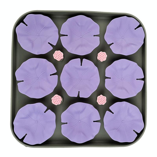 Soothe your pet's anxiety and promote healthier eating habits with the Lotus Leaf Silicone Pet Licking Pad. This innovative slow feeder mat features a textured, lotus leaf design that makes mealtimes more engaging and helps prevent choking and indigestion in cats and dogs. Made from durable, food-grade silicone, this lick mat is easy to clean and features strong suction cups on the bottom to keep it securely in place on smooth surfaces. Simply spread your pet's favourite soft treat (wet food, yoghurt, peanut butter) across the surface and watch them enjoy a calming and enriching feeding experience. Suitable for both cats and dogs. Approximate size: 20 x 20cm. Available in blue and purple.