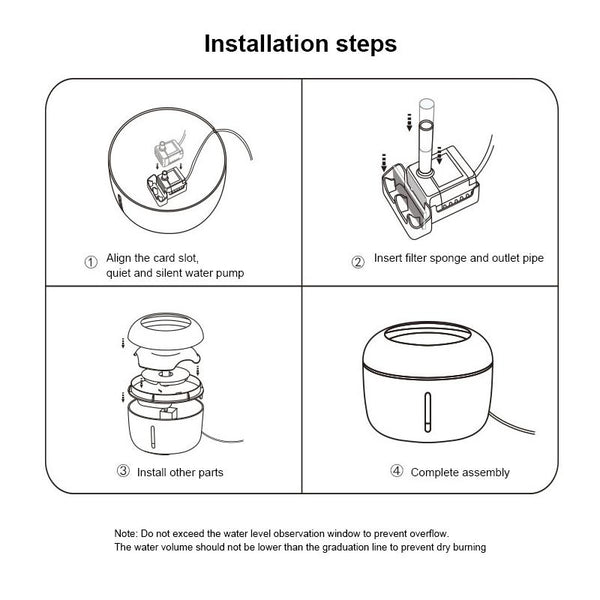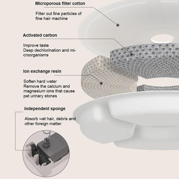Keep your furry friend hydrated with the Pet Automatic Circulating Filtering Water Dispenser. This 2.5L water fountain (20x20x15.3cm) encourages cats and dogs to drink more with its fresh, filtered water. Featuring quadruple filtration, including activated carbon for deep dechlorination and microorganism removal, an ion exchange resin to soften hard water, and a unique carbon sheet to catch hair and debris, this dispenser ensures healthy, clean water. The microporous filter cotton further polishes the water, delivering oxygen-rich hydration. Easy to clean with a split design, simple disassembly, and convenient water changes. Includes one filter and a USB power cord. Dry burn protection provides added safety. Available in white.