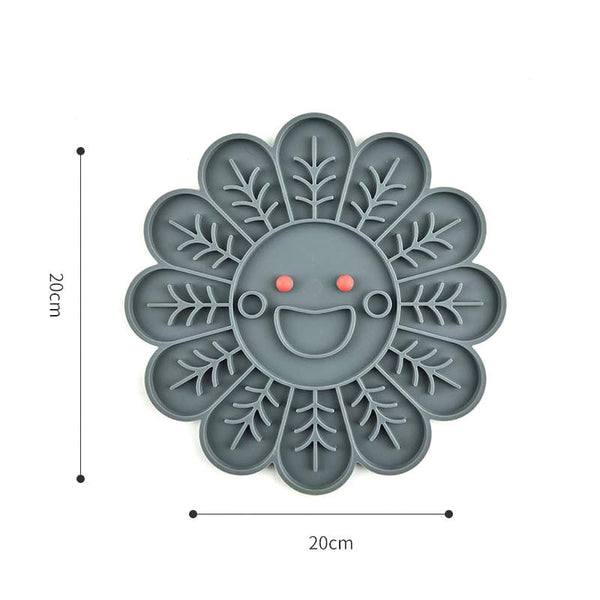 Slow down mealtimes and improve digestion for your cat or dog with this silicone slow feeder mat. The flower-shaped design (in grey) makes mealtimes fun while promoting healthier eating habits by preventing gulping and reducing bloating. Made from durable, food-grade silicone, this mat is soft, flexible, and easy to clean. It's also dishwasher safe and can withstand temperatures from -20°C to 200°C. Suitable for both cats and dogs. Approximate dimensions: 20x20cm.