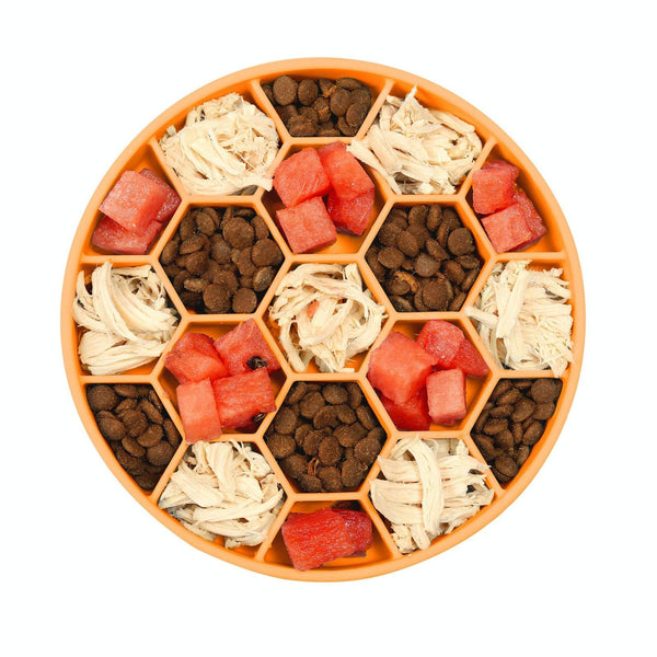 Slow down your pet's eating and prevent choking with this innovative honeycomb slow feeder bowl. Made from durable, food-grade silicone, this bowl features a unique honeycomb design that encourages slower eating, promoting healthier digestion. The strong octopus suction cups on the base prevent spills and sliding, keeping the bowl securely in place, even for enthusiastic eaters. This small, orange bowl (16x16x4.3cm) weighs 240g and is suitable for small dogs and cats. Heat resistant from -40°C to 260°C, it's dishwasher safe for easy cleaning. Upgrade your pet's mealtimes with this practical and effective slow feeder.