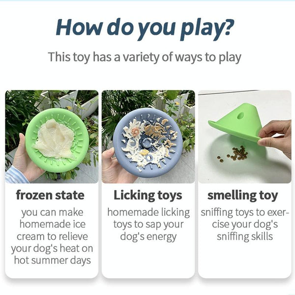 Enrich your dog's mealtimes with this fun and interactive silicone slow feeder bowl. Designed like an inverted bowl, it hides food within its textured surface, enticing your dog to use their paws and tongue to extract tasty morsels. This engaging design promotes slower eating, aiding digestion and preventing bloat. Made from food-grade silicone, this durable and flexible bowl is easy to clean, dishwasher safe, and can even be used for frozen treats. Suitable for wet, dry, or raw food. Dimensions: 15cm diameter x 7cm height. Weight: 163g. Available in a stylish grey and white colour combination.