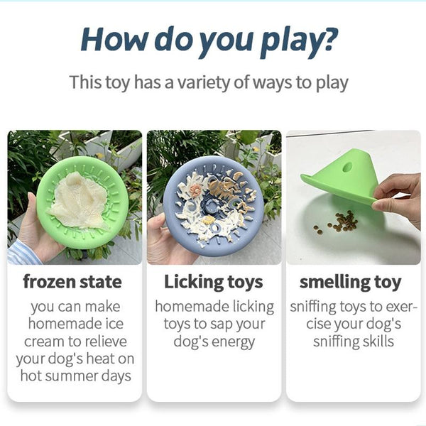 Enrich your dog's mealtimes with this fun and interactive silicone slow feeder bowl in light blue. Designed like an inverted bowl, it cleverly hides food, enticing your dog with delicious aromas. As your dog paws and plays, tasty morsels are revealed, encouraging slower eating and reducing the risk of gulping and indigestion. Crafted from food-grade silicone, this durable and flexible bowl promotes healthy digestion and helps prevent bloat. It's also great for stimulating your dog's curiosity and problem-solving skills. Easy to clean and dishwasher safe, this versatile bowl can be heated or frozen for added mealtime excitement. Measuring 15cm in diameter and 7cm in height, with a weight of 163g, it's the perfect size for most dogs.