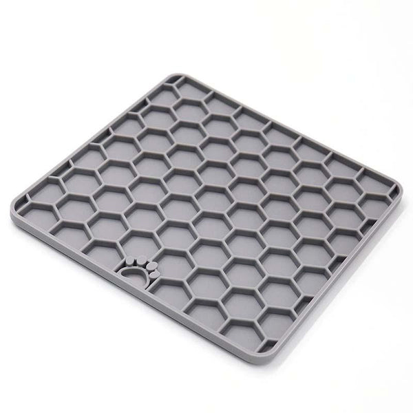 Licking this silicone slow feeder mat soothes and calms your dog during mealtimes, grooming, vet visits, and even thunderstorms. Made from durable, food-grade silicone, this grey pet supplies slow feeder features a textured surface that promotes healthy eating habits by slowing down food consumption, reducing bloating and indigestion. The strong suction cup base keeps the mat securely in place, preventing spills and messes. Suitable for wet food, dry food, yoghurt, or peanut butter. Easy to clean and dishwasher safe, this 18.7x18.7x0.7cm mat is a practical and hygienic addition to your pet's mealtime routine.