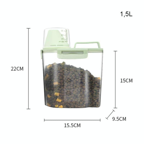Keep your pet's food fresh and dry with this 1.5L pet food storage bucket. Made from safe, translucent PP plastic, this airtight container features a secure 4-snap locking lid with a double sealed rubber ring to maintain optimal freshness. The integrated measuring cup lid with clear markings helps prevent overfeeding or underfeeding, promoting healthy portion control. The convenient carry handle and side grooves ensure easy handling and pouring, while the funnel opening minimises spills. This 1.5L storage bucket holds approximately 1000g of dry pet food and measures 15.5 x 9.5 x 22 cm. Ideal for storing dry kibble, biscuits, or treats.