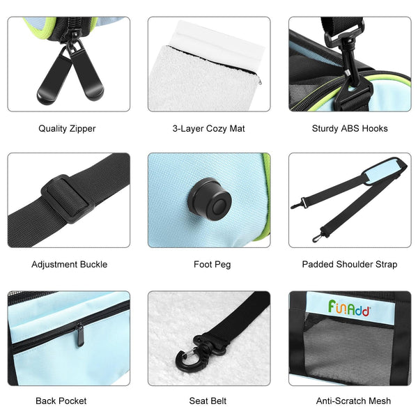 Transport your furry friend in comfort and style with the FUNADD Pet Travel Carrier Bag. Crafted from durable 600D Oxford fabric, this foldable tote bag provides excellent ventilation with large mesh panels, ensuring your pet enjoys a comfortable journey. The zippered side entrances allow for easy access, making airport security checks a breeze. A padded shoulder strap and sturdy handles offer comfortable carrying options, while the reinforced base and iron frame maintain the carrier's shape, preventing sagging. A soft fleece mat adds extra comfort for your pet. Perfect for small dogs and cats, this carrier measures 44 x 28 x 28cm (17.3 x 11 x 11 inches) and supports pets up to 9kg. Upgrade your pet's travel experience with the FUNADD Pet Travel Carrier – available now in blue.