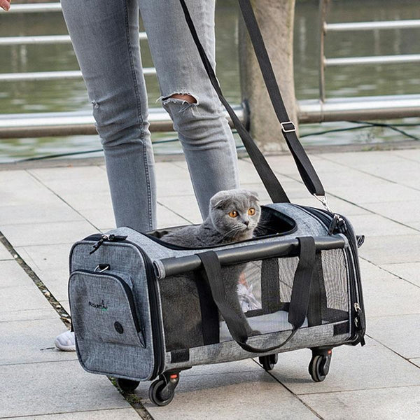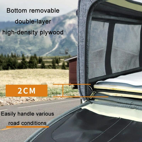Durable polyester construction with anti-scratch and bite-resistant mesh ensures long-lasting use. Adjustable shoulder straps and high-quality SBS zippers with secure buckles offer comfortable carrying and peace of mind. A detachable double-layer high-density plywood base provides stability on various terrains, while the built-in safety tether keeps your pet secure during travel.