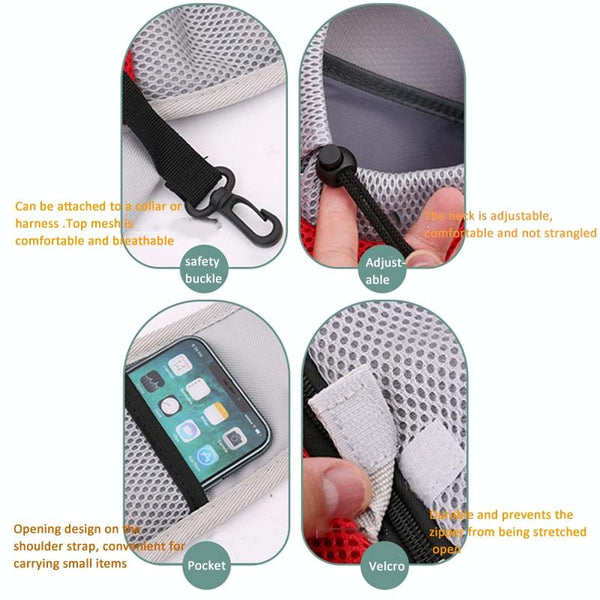 Travel in comfort and style with this breathable pet carrier bag, perfect for cats and small dogs up to 7.5kg. The large, airy mesh panels provide excellent ventilation, keeping your furry friend cool and calm during journeys. Easy-access openings allow for effortless loading and unloading, while the adjustable neck drawstring ensures a secure and comfortable fit. Added safety features include an internal safety buckle to attach to your pet's collar or harness. Convenient shoulder strap pockets keep essentials like treats and keys close at hand. Crafted from durable Oxford cloth and breathable mesh, this carrier is available in Large (47 x 29 x 14cm) and weighs just 273g. Choose this red pet carrier for a stylish and practical travel solution.